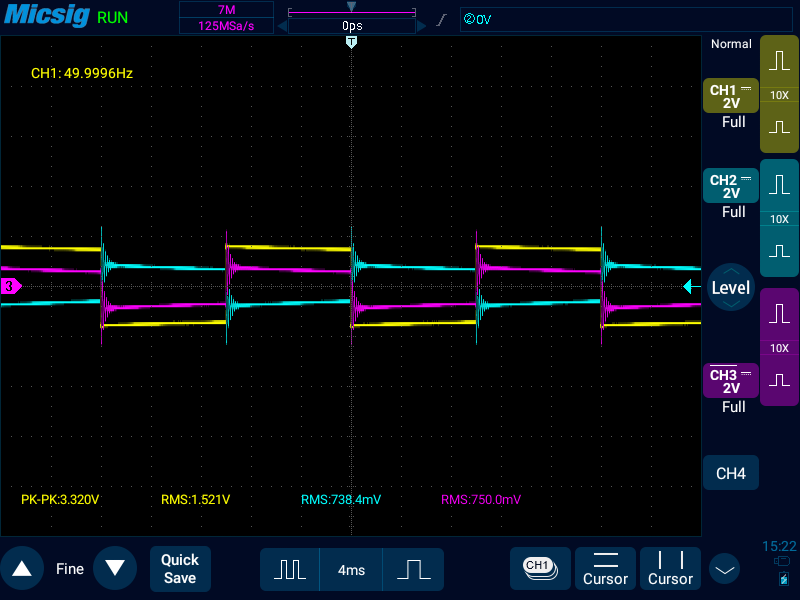 De eerste meting is bij een normale netspanningsfrequentie van 50 Hertz. In de onderstaande afbeelding is geel de ingangsspanning van L2. Blauw is de uitgangsspanning van L1 en paars is de geïnverteerde uitgangsspanning van L3.